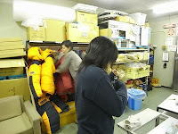 ★せっかく極地研にきたのだから、とみんなで低温室に行って休憩?★みな、順番に好きなダウンジャケットを選んで身に着けます。ごつい長靴もあり。みなわくわく状態。
